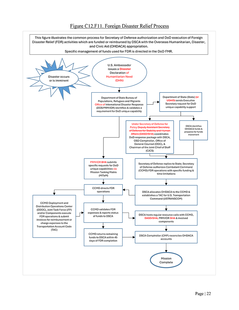 C12.8.4. Secretary of Defense Foreign Disaster Relief Authorization. If the SECDEF intends to authorize DoD FDR activity, USD(P)DASD(SHA), in coordination with DSCA, prepares a SECDEF FDR authorization memorandum. The SECDEF memorandum outlines parameters of the approved FDR operation, including associated authorities and funding. DASD(SHA), Joint Staff (JS), pertinent CCMDs, and their components develop cost estimates for anticipated DoD FDR support requirements and communicate them to DSCA. The DoD FMR Volume 12, Chapter 23, provides specific financial management responsibilities and instructions for the development of DoD FDR cost estimates as well as the request for funding or subsequent reimbursement from DSCA. USD(P)DASD(SHA) coordinates the SECDEF FDR Authorization memorandum with DSCA, JS, relevant Office of the Under Secretary of Defense for Policy (OUSD(P)) regional offices, DoD Office of General Counsel (DoD (OGC)), OUSD(C), and, as appropriate, the Under Secretary of Defense for Acquisition and Sustainment (USD (A&S)).